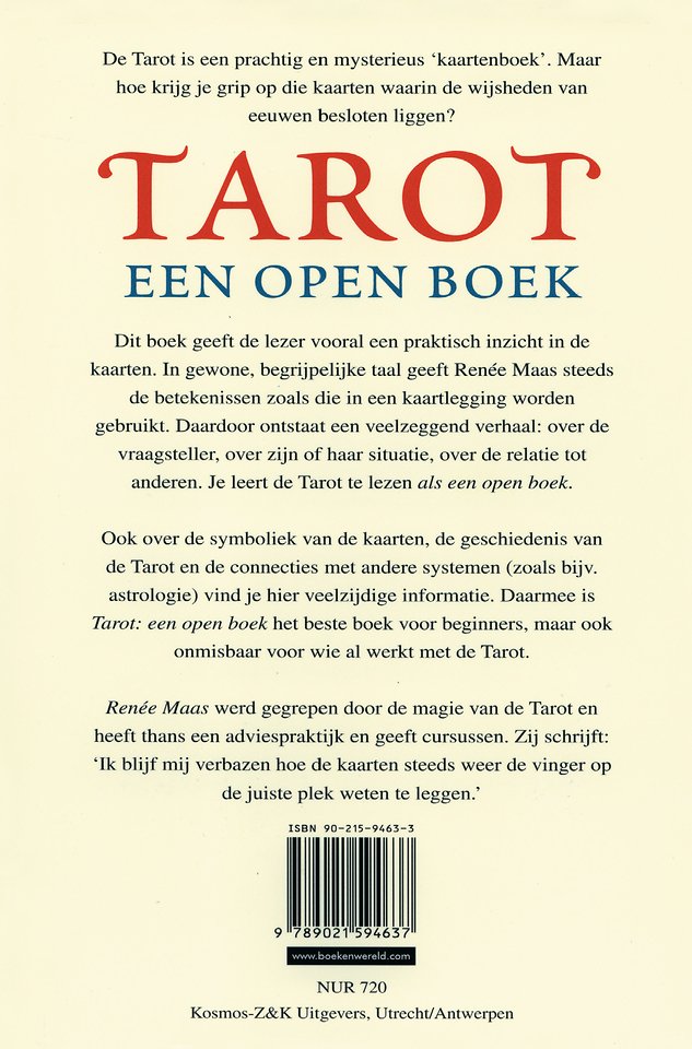De Tarot is een prachtig en mysterieus 'kaartenboek'. Maar hoe krijg je grip op die kaarten waarin de wijsheden van eeuwen besloten liggen? Dit boek geeft de lezer vooral een praktisch inzicht in de kaarten. In gewone, begrijpelijke taal geeft Renée Maas steeds de betekenissen zoals die in een kaartlegging worden gebruikt. Daardoor ontstaat een veelzeggend verhaal: over de vraagsteller, over zijn of haar situatie, over de relatie tot anderen. Je leert de Tarot lezen 'als een open boek'. Ook over de symboliek van de kaarten, de geschiedenis van de Tarot en de connecties met andere systemen (zoals bijv. astrologie) vind je hier veelzijdige informatie. Daarmee is 'Tarot: een open boek' het beste boek voor beginners, maar ook onmisbaar voor wie al werkt met de Tarot.