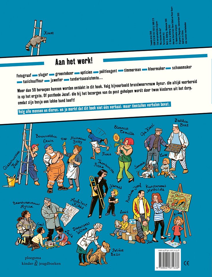 Fotograaf - slager - groenteboer - opticien - politieagent - timmerman - kleermaker - schoonmaker - taxichauffeur - juwelier - tandartsassistente... Meer dan 50 beroepen kunnen worden ontdekt in dit boek. Volg bijvoorbeeld brandweervrouw Aynur, die altijd voorbereid is op het ergste. Of postbode Jozef, die bij het bezorgen van de post geholpen wordt door twee kinderen uit het dorp, omdat zijn busje een lekke band heeft! Volg alle mensen en dieren, en je merkt dat dit boek niet één verhaal, maar tientallen verhalen bevat.
