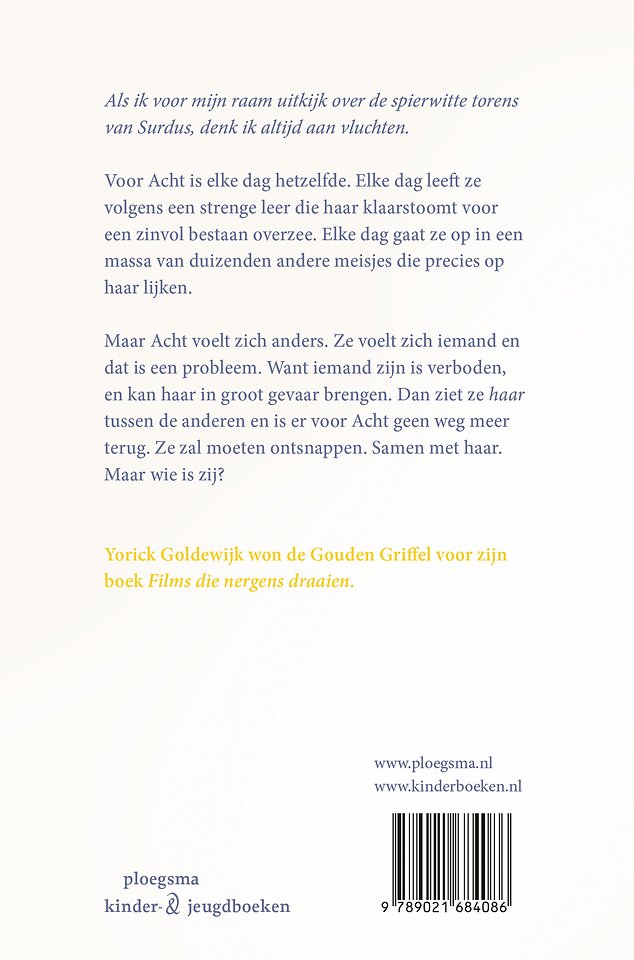 Maar Acht voelt zich anders. Ze voelt zich 'iemand' en dat is een probleem. Want iemand zijn is verboden, en kan haar in groot gevaar brengen. Dan ziet ze 'haar' tussen de anderen en is er voor Acht geen weg meer terug. Ze zal moeten ontsnappen. Samen met haar.