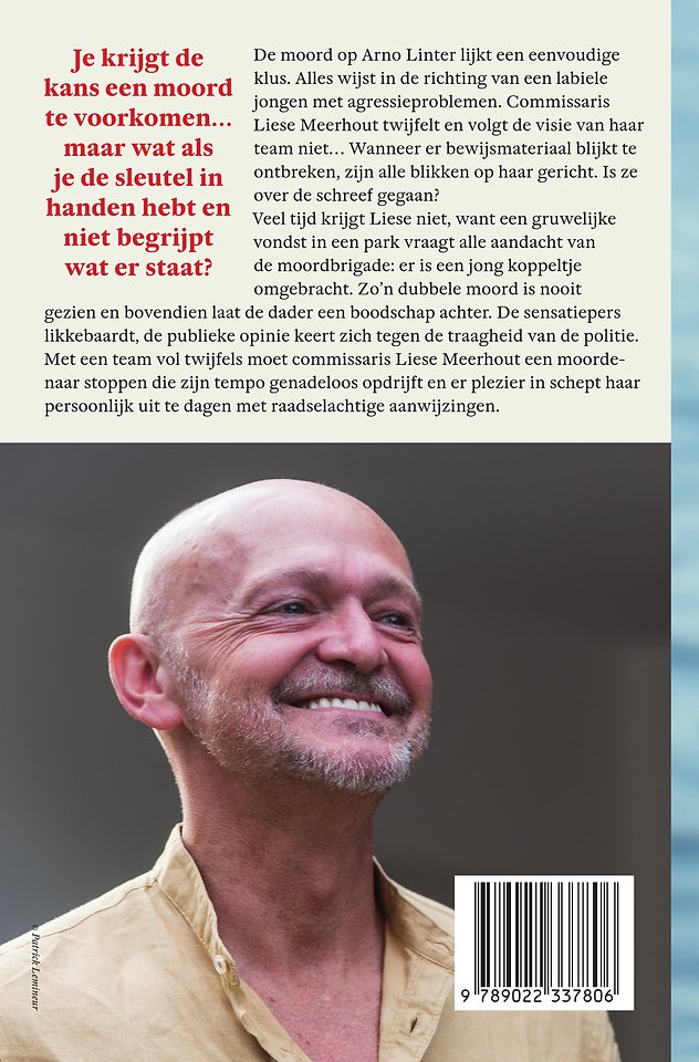 De moord op Arno Linter lijkt een eenvoudige klus. Alles wijst in de richting van een labiele jongen met agressieproblemen. Commissaris Liese Meerhout twijfelt en volgt de visie van haar team niet… Wanneer er bewijsmateriaal blijkt te ontbreken, zijn alle blikken op haar gericht. Is ze over de schreef gegaan? Veel tijd krijgt Liese niet, want een gruwelijke vondst in een park vraagt alle aandacht van de moordbrigade: er is een jong koppeltje omgebracht. Zo’n dubbele moord is nooit gezien en bovendien laat de dader een boodschap achter. De sensatiepers likkebaardt, de publieke opinie keert zich tegen de traagheid van de politie. Met een team vol twijfels moet commissaris Liese Meerhout een moordenaar stoppen die zijn tempo genadeloos opdrijft en er plezier in schept haar persoonlijk uit te dagen met raadselachtige aanwijzingen.