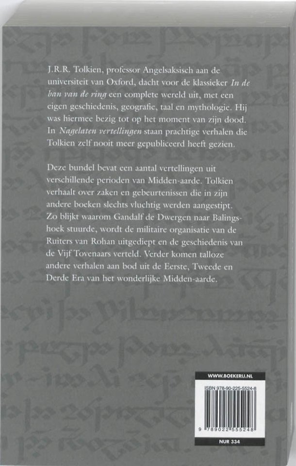 In Nagelaten vertellingen staan prachtige verhalen die Tolkien zelf nooit meer gepubliceerd heeft gezien. Deze bundel bevat een aantal vertellingen uit verschillende perioden van Midden-aarde. Tolkien verhaalt over zaken en gebeurtenissen die in zijn andere boeken slechts vluchtig werden aangestipt. Zo blijkt waarom Gandalf de Dwergen naar Balingshoek stuurde, wordt de militaire organisatie van de Ruiters van Rohan uitgediept en de geschiedenis van de Vijf Tovenaars verteld. Verder komen talloze andere verhalen aan bod uit de Eerste, Tweede en Derde Era van het wonderlijke Midden-aarde. Nagelaten vertellingen is het sluitstuk van Tolkiens oeuvre.