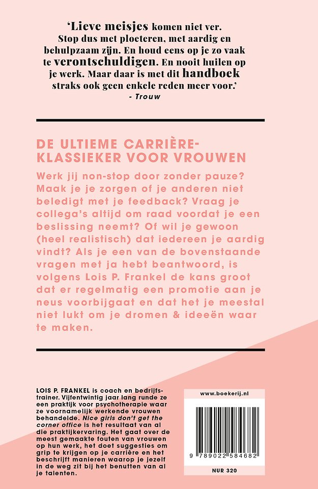 Lois P. Frankel is coach en bedrijfstrainer. Vijfentwintig jaar lang runde ze een praktijk voor psychotherapie waar ze voornamelijk werkende vrouwen behandelde. 'Nice girls don’t get the corner office' is het resultaat van al die praktijkervaring. Het gaat over de meest gemaakte fouten van vrouwen op hun werk, het doet suggesties om grip te krijgen op je carrière en het beschrijft manieren waarop je jezelf in de weg zit bij het benutten van al je talenten. De praktische adviezen zijn onderverdeeld in zes thema's: hoe je het spel speelt; hoe je je gedraagt; hoe je denkt; hoe je jezelf op de markt brengt; hoe je klinkt; hoe je eruitziet en hoe je reageert.