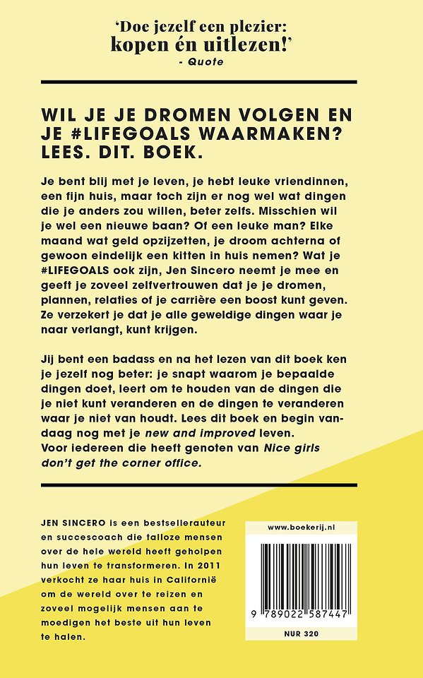Wat je #lifegoals ook zijn, Jen Sincero neemt je mee en geeft je zoveel zelfvertrouwen dat je je dromen, plannen, relaties of je carrière een boost kunt geven. Ze verzekert je dat je alle geweldige dingen waar je naar verlangt, kunt krijgen.