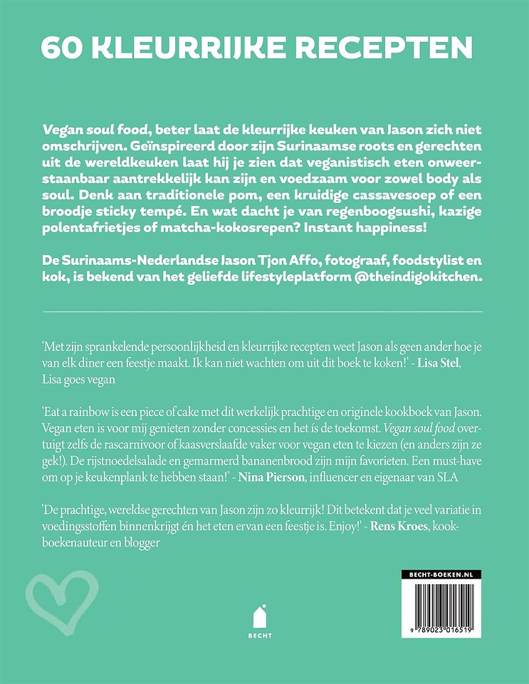 Jason Tjon Affo - online beter bekend als The Indigo Kitchen - heeft duizenden volgers die uitkijken naar zijn kleurrijke creaties. Zijn gerechten zijn namelijk niet alleen overheerlijk, maar ook ware blikvangers. Van ontbijtjes, drankjes en broodjes tot uitgebreide diners, snacks en zoete lekkernijen: al zijn boeken staan boordevol verleidelijke en verrassende vegan recepten voor ieder moment van de dag.