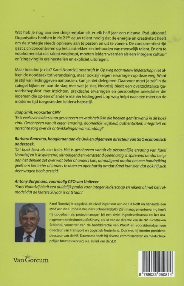 Maar hoe doe je dat? Karel Noordzij beschrijft in 'Op weg naar nieuw leiderschap' niet alleen de noodzaak tot verandering, maar ook zijn eigen ervaringen op deze weg. Want je stijl van leidinggeven aanpassen, kun je niet delegeren. Daarvoor moet je zelf in de spiegel kijken en aan de slag met wat je ziet. Noordzij biedt een overzichtelijke 'gereedschapskist' met inzichten, praktische ervaringen en persoonlijke anekdotes die iedereen die op een of andere manier leidinggeeft, op weg helpt naar een meer op de moderne tijd toegesneden leiderschapsstijl.
