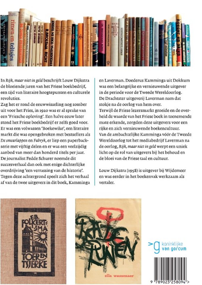 Rijk, maar niet in geld vertelt het verhaal van twee opeenvolgende Friese uitgevers, Kamminga en Laverman, tegen de achtergrond van de intellectualisering van het Fries tussen 1920 en 1970. Deze periode is achteraf beschouwd de 'Gouden halve eeuw' van de Friese cultuur: in die halve eeuw settelde het Fries, dat begin 1900 nog een volkstaal was, zich stevig als cultuurtaal, en dat ging gepaard met (en hing ook samen met) een opbloei van de Friestalige cultuur.