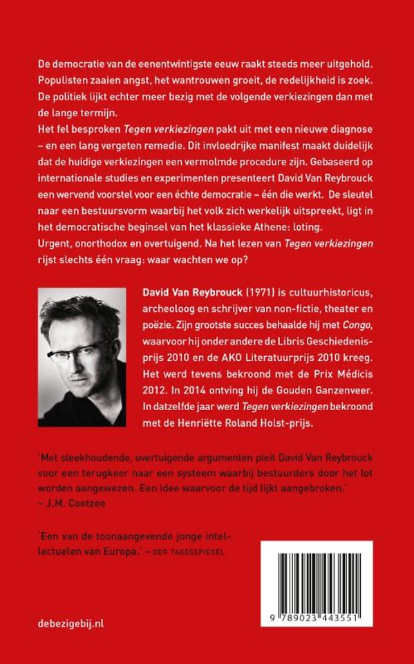 Het fel besproken 'Tegen verkiezingen' pakt uit met een nieuwe diagnose – en een lang vergeten remedie. Dit invloedrijke manifest maakt duidelijk dat de huidige verkiezingen een vermolmde procedure zijn. Gebaseerd op internationale studies en experimenten presenteert David Van Reybrouck een wervend voorstel voor een échte democratie – één die werkt. De sleutel naar een bestuursvorm waarbij het volk zich werkelijk uitspreekt, ligt in het democratische beginsel van het klassieke Athene: loting.