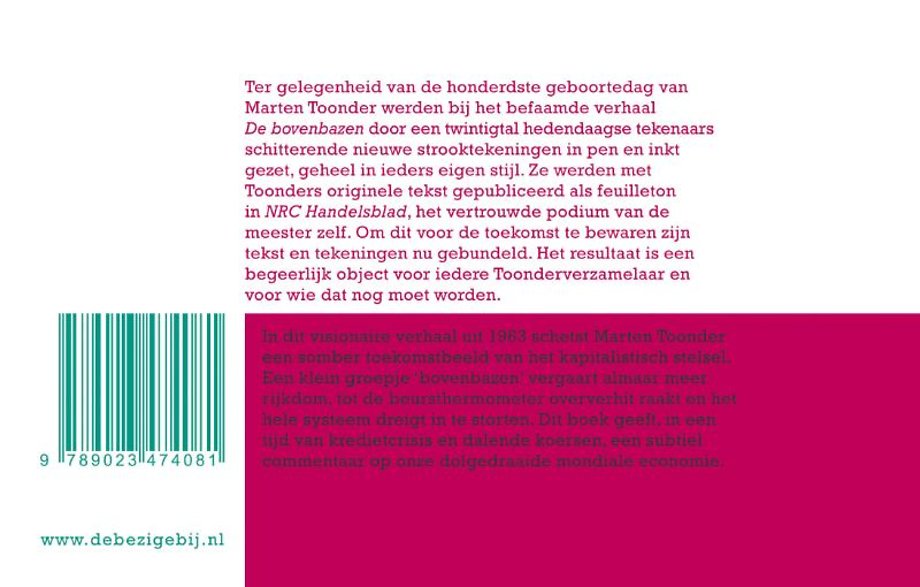 In zijn Bommel-avontuur De bovenbazen uit 1963 schetst Marten Toonder een somber toekomstbeeld van het kapitalistisch stelsel. Een klein groepje 'bovenbazen' vergaart almaar meer rijkdom, tot de beursthermometer oververhit raakt en het hele systeem dreigt in te storten. Dit visionaire boek geeft, in een tijd van kredietcrisis en dalende koersen, een subtiel commentaar op onze dolgedraaide mondiale economie.