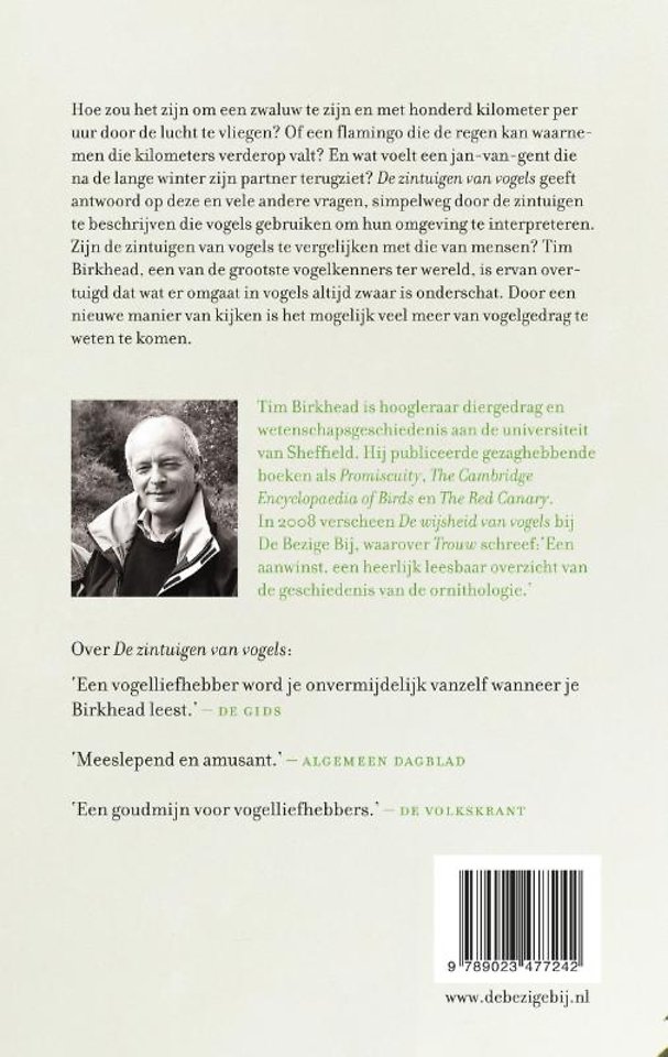 Hoe zou het zijn om een zwaluw te zijn en met honderd kilometer per uur door de lucht te vliegen? Of een flamingo die de regen kan waarnemen die kilometers verderop valt? En wat voelt een jan-van-gent die na de lange winter zijn partner terugziet? De zintuigen van vogels geeft antwoord op deze en vele andere vragen, simpelweg door de zintuigen te beschrijven die vogels gebruiken om hun omgeving te interpreteren. Zijn de zintuigen van vogels te vergelijken met die van mensen? Tim Birkhead, een van de grootste vogelkenners ter wereld, is ervan overtuigd dat wat er omgaat in vogels altijd zwaar is onderschat. Door een nieuwe manier van kijken is het mogelijk veel meer van vogelgedrag te weten te komen.