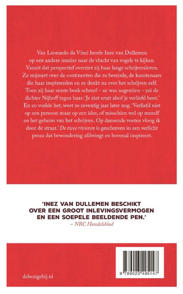 Van Leonardo da Vinci leerde Inez van Dullemen op een andere manier naar de vlucht van vogels te kijken. Vanuit dat perspectief overziet zij haar lange schrijversleven. Ze mijmert over de continenten die ze bereisde, de kunstenaars die haar inspireerden en ze denkt na over het schrijven zelf. Toen zij haar eerste boek schreef – ze was negentien – zei de dichter Nijhoff tegen haar: ‘Je ziet eruit of je verliefd bent.’ En zo voelde het, weet ze zeventig jaar later nog. ‘Verliefd niet op een persoon maar op een idee, of misschien wel op mezelf en het geheim van het schrijven. Op dansende voeten vloog ik door de straat.’ De twee rivieren is geschreven in een verlicht proza dat bewondering afdwingt en bovenal inspireert.