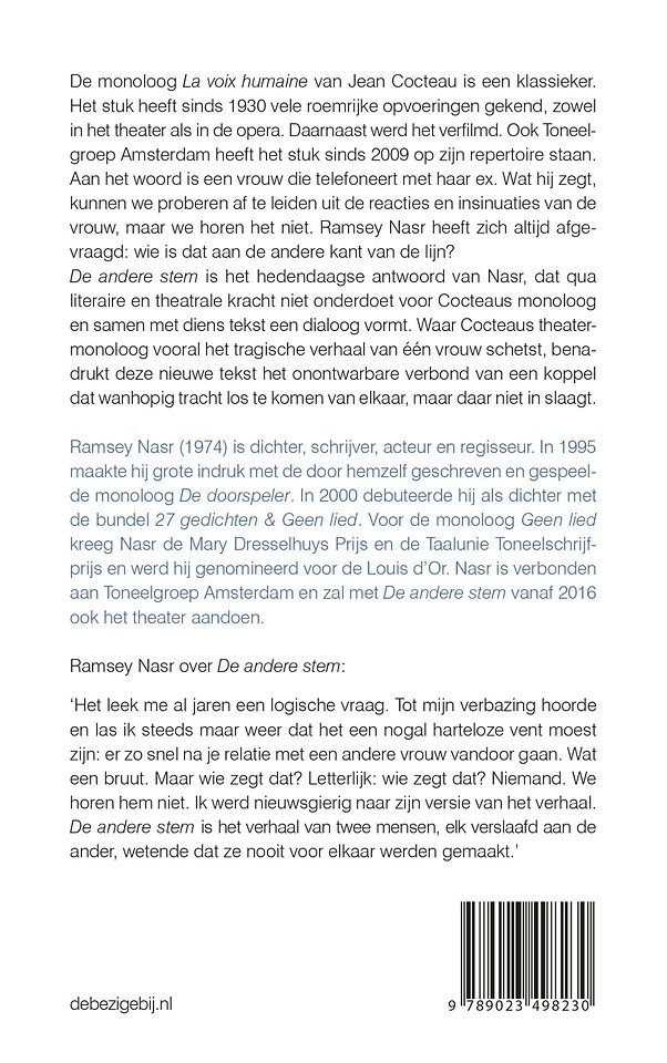 De monoloog La voix humaine van Jean Cocteau uit 1928 is een klassieker. Het stuk heeft sinds 1930 vele roemrijke opvoeringen gekend, zowel in het theater als in de opera. Daarnaast werd het verfilmd. Ook Toneelgroep Amsterdam heeft het stuk sinds 2009 op zijn repertoire staan. Aan het woord is een vrouw die telefoneert met haar ex. Wat hij zegt, kunnen we proberen af te leiden uit de reacties en insinuaties van de vrouw, maar we horen het niet. Ramsey Nasr heeft zich altijd afgevraagd: wie is dat aan de andere kant van de lijn?