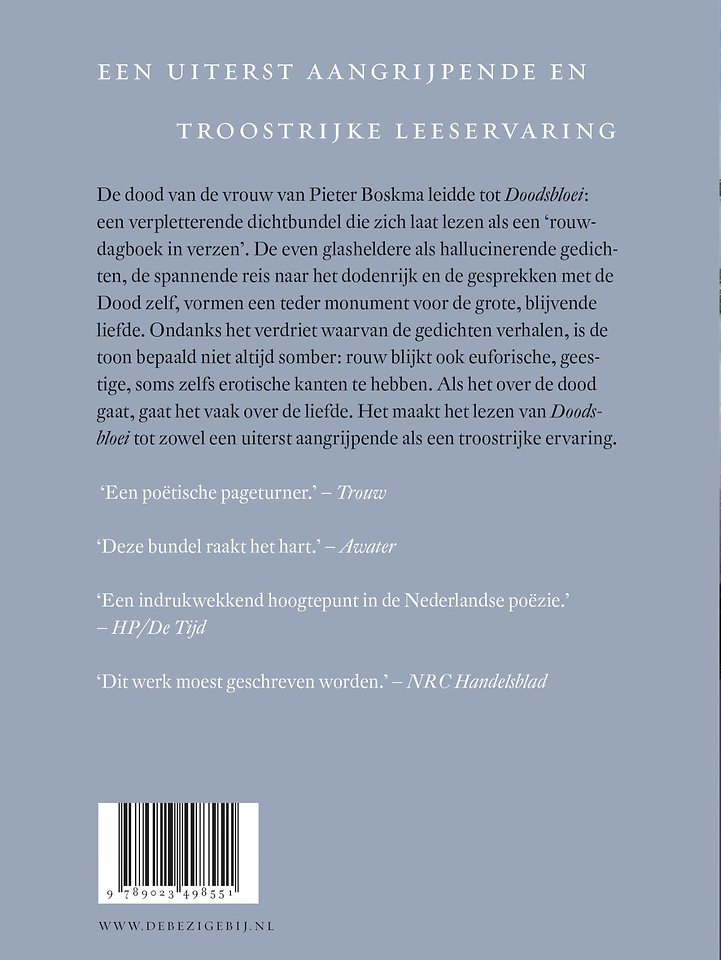 Enige jaren geleden overleed de vrouw van Pieter Boskma aan de gevolgen van borstkanker. Die tragedie leidde tot deze verpletterende dichtbundel die zich laat lezen als een ‘rouwdagboek in verzen’. In Doodsbloei bouwt Boskma een teder monument voor de grote, blijvende liefde, met glasheldere en hallucinerende gedichten, een spannende reis naar het dodenrijk en gesprekken met de Dood zelf. Ondank het verdriet waarvan de gedichten verhalen, is de toon bepaald niet altijd somber. Wie Doodsbloei leest, ervaart dat rouw ook euforische, geestige en soms zelfs erotische kanten heeft. Als het over de dood gaat, blijkt het vaak over de liefde te gaan.
