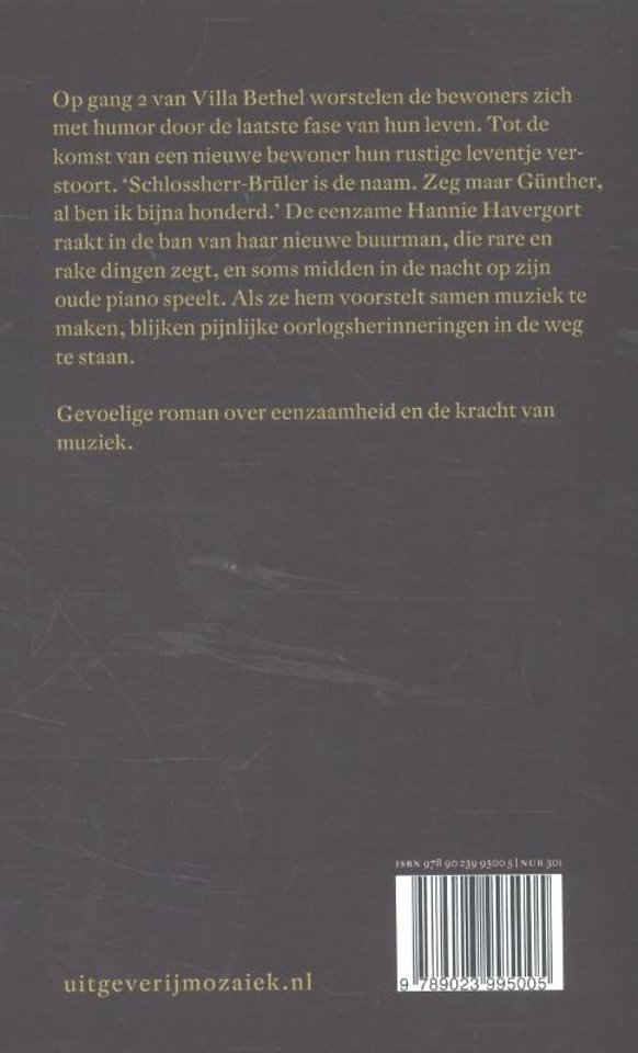 Op gang 2 van Villa Bethel worstelen de bewoners zich met humor door de laatste fase van hun leven. Tot de komst van een nieuwe bewoner hun rustige leventje verstoort. ‘Slossherr-Brüler is de naam. Zeg maar Günther, al ben ik bijna honderd.’ De eenzame Hannie Havergort raakt in de ban van haar nieuwe buurman, die rare en rake dingen zegt, en soms midden in de nacht op zijn oude piano speelt. Als ze hem voorstelt samen muziek te maken, blijken pijnlijke oorlogsherinneringen in de weg te staan.