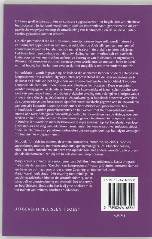 Dit boek geeft uitgangspunten en concrete suggesties voor het begeleiden van effectieve leerprocessen. Met dit boek kunnen begeleiders ervoor zorgdragen dat leertrajecten effectief zijn. Het model dat in het boek gepresenteerd wordt, de Interventiekaart, is toepasbaar als diagnose- en adviesmodel bij de ontwikkeling van effectieve leertrajecten. De Interventiekaart is ook te gebruiken als begeleidingsmodel tijdens leertrajecten en als richtingaanwijzer wanneer leertrajecten lijken te stagneren. Het boek sluit af met een beschouwing van begeleiding van leerprocessen als weg naar permanente educatie. 'Het begeleiden van effectieve leerprocessen' is een praktisch boek voor professionele begeleiders zoals opleiders, coaches, trainers, organisatie-adviseurs en personeelsfunctionarissen.