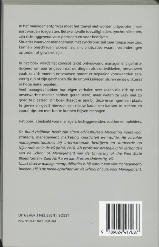 In het managementproces moet het toeval niet worden uitgesloten maar juist worden toegelaten. Betekenisvolle toevalligheden, synchroniciteiten, zijn richtinggevend voor personen en voor bedrijven. Situaties waarvoor management met synchroniciteit zeer toepasbaar zijn, kunnen omschreven worden als al die situaties waarin veranderingen optreden of gewenst zijn. In 'Management met synchroniciteit' wordt het concept (zich) ontvouwend management geïntroduceerd om aan te geven dat de dingen zich ontwikkelen, ontvouwen zoals ze zich moeten ontvouwen omdat er bepaalde voorwaarden aanwezig zijn of zijn geschapen die de ontwikkelingen sturen en de uitkomst in hoge mate bepalen.
