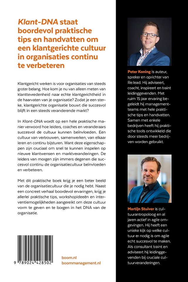 Meer over de auteurs'Klant-DNA' staat boordevol praktische tips en handvatten om een klantgerichte cultuur in organisaties continu te verbeteren