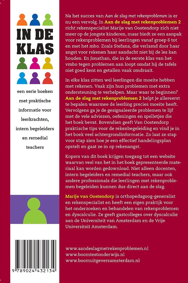 Aan de slag met rekenproblemen hoort bij de serie In de klas. Deze serie bestaat uit een reeks praktische boeken voor docenten, leerkrachten, intern begeleiders en remedial teachers. De boeken zijn geschreven door professionals uit het vakgebied. Zij geven achtergrondinformatie en praktische tips waarmee u direct aan de slag kunt.
