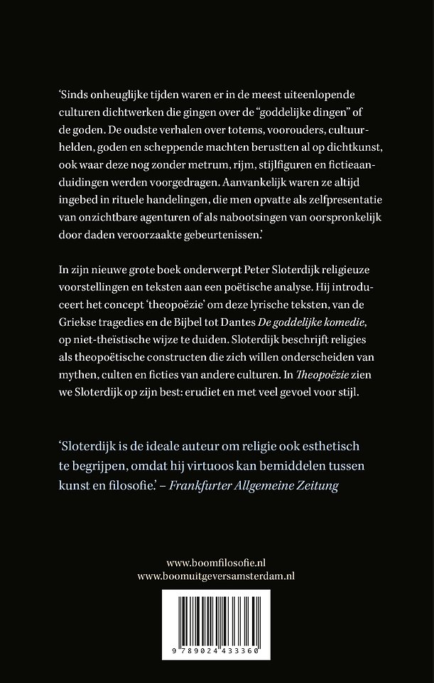 In zijn nieuwe grote boek onderwerpt Peter Sloterdijk religieuze voorstellingen en teksten aan een poëtische analyse. Hij introduceert het concept ‘theopoëzie’ om deze lyrische teksten, van de Griekse tragedies en de Bijbel tot Dantes De goddelijke komedie, op niet‑theïstische wijze te duiden. Sloterdijk beschrijft religies als theopoëtische constructen die zich willen onderscheiden van mythen, culten en ficties van andere culturen. In Theopoëzie zien we Sloterdijk op zijn best: erudiet en met veel gevoel voor stijl.