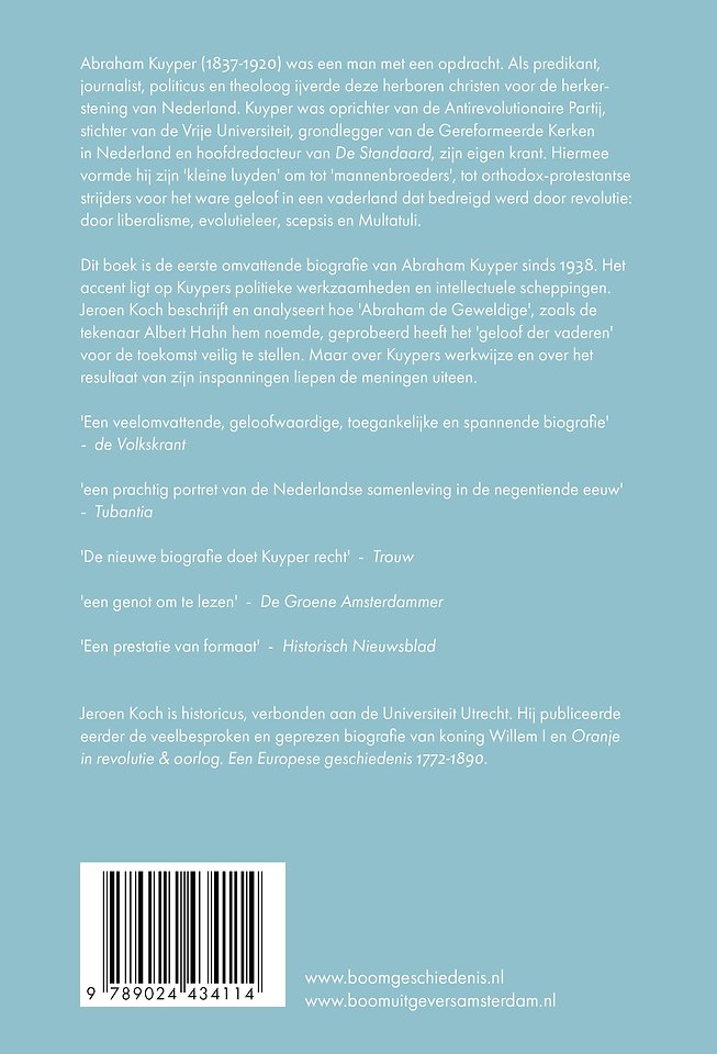 Dit boek is de eerste omvattende biografie van Abraham Kuyper sinds 1938. Het accent ligt op Kuypers politieke werkzaamheden en intellectuele scheppingen. Jeroen Koch beschrijft en analyseert hoe 'Abraham de Geweldige', zoals de tekenaar Albert Hahn hem noemde, geprobeerd heeft het 'geloof der vaderen' voor de toekomst veilig te stellen. Maar over Kuypers werkwijze en over het resultaat van zijn inspanningen liepen de meningen uiteen.