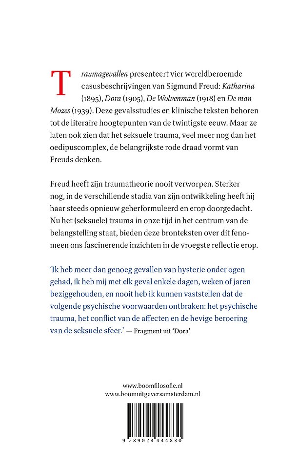 Freud heeft zijn traumatheorie nooit verworpen. Sterker nog, in de verschillende stadia van zijn ontwikkeling heeft hij haar steeds opnieuw geherformuleerd en erop doorgedacht. Nu het (seksuele) trauma in onze tijd in het centrum van de belangstelling staat, bieden deze bronteksten over dit fenomeen ons fascinerende inzichten in de vroegste reflectie erop.