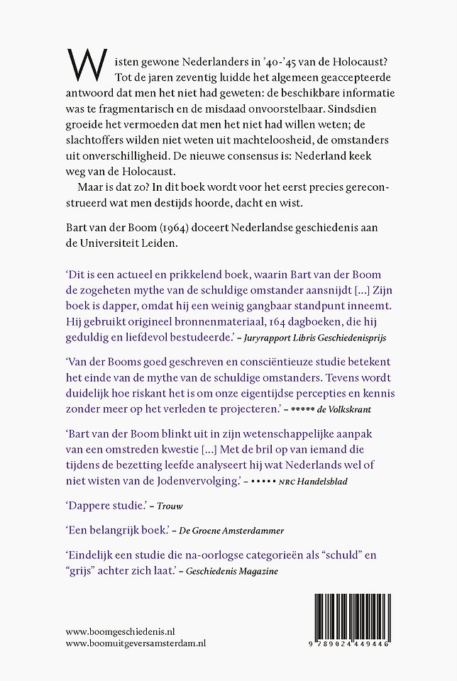 Wisten gewone Nederlanders in ’40-’45 van de Holocaust? Tot de jaren zeventig luidde het algemeen geaccepteerde antwoord dat men het niet had geweten: de beschikbare informatie was te fragmentarisch en de misdaad onvoorstelbaar. Sindsdien groeide het vermoeden dat men het niet had willen weten; de slachtoffers wilden niet weten uit machteloosheid, de omstanders uit onverschilligheid. De nieuwe consensus is: Nederland keek weg van de Holocaust.