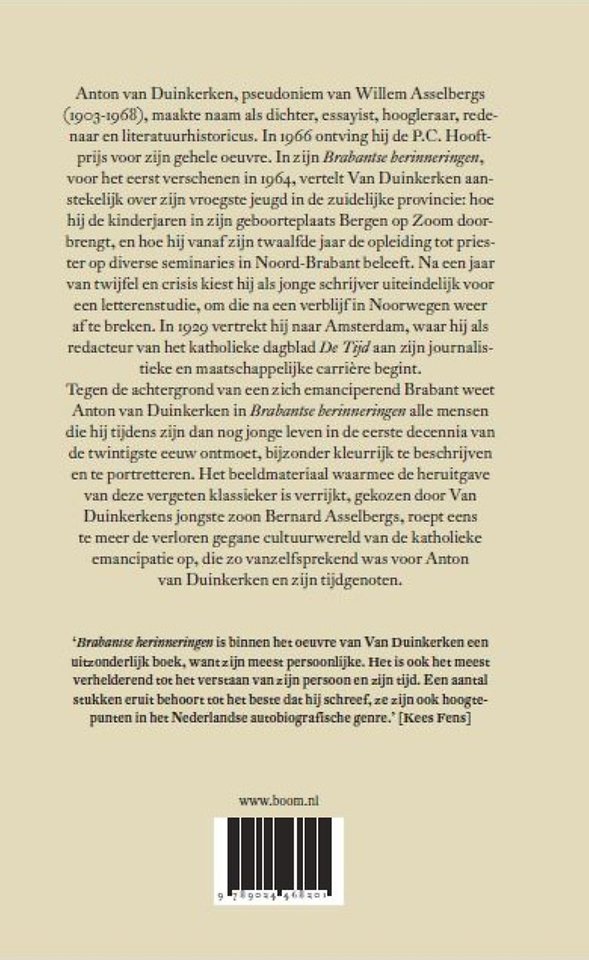 Anton van Duinkerken, pseudoniem van Willem Asselbergs (1903-1968), maakte naam als dichter, essayist, hoogleraar, redenaar en literatuurhistoricus. In 1966 ontving hij de P.C. Hooftprijs voor zijn gehele oeuvre. In zijn Brabantse herinneringen, voor het eerst verschenen in 1964, vertelt Van Duinkerken aanstekelijk over zijn vroegste jeugd in de zuidelijke provincie: hoe hij de kinderjaren in zijn geboorteplaats Bergen op Zoom doorbrengt, en hoe hij vanaf zijn twaalfde jaar de opleiding tot priester op diverse seminaries in Noord-Brabant beleeft. Na een jaar van twijfel en crisis kiest hij als jonge schrijver uiteindelijk voor een letterenstudie, om die na een verblijf in Noorwegen weer af te breken. In 1929 vertrekt hij naar Amsterdam, waar hij als redacteur van het katholieke dagblad De Tijd aan zijn journalistieke en maatschappelijke carrière begint.