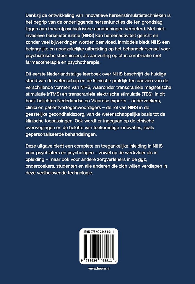 Dit eerste Nederlandstalige leerboek over NIHS beschrijft de huidige stand van de wetenschap en de klinische praktijk ten aanzien van de verschillende vormen van NIHS, waaronder transcraniële magnetische stimulatie (rTMS) en transcraniële elektrische stimulatie (TES). In dit boek belichten Nederlandse en Vlaamse experts – onderzoekers, clinici en patiëntvertegenwoordigers – de rol van NIHS in de geestelijke gezondheidszorg, van de wetenschappelijke basis tot de klinische toepassingen. Ook wordt er ingegaan op de ethische overwegingen en de belofte van toekomstige innovaties, zoals gepersonaliseerde behandelingen.