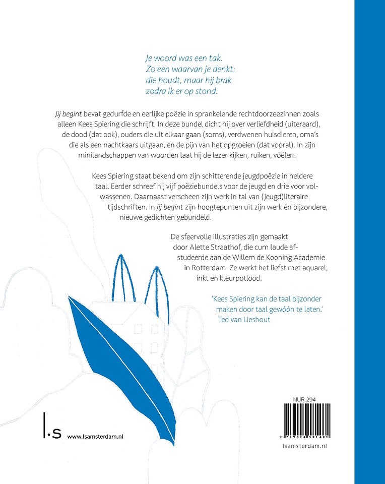 Kees Spiering staat bekend om zijn schitterende jeugdpoëzie in heldere taal. Nu, bijna vijftien jaar na zijn laatste dichtbundel, is er Jij begint: een prachtig verzorgde uitgave met bijzondere illustraties van de jonge, getalenteerde Alette Straathof.