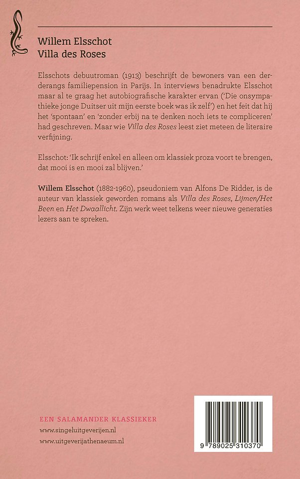 Elsschots debuutroman (1913) beschrijft de bewoners van een derderangs familiepension in Parijs. In interviews benadrukte Elsschot maar al te graag het autobiografische karakter ervan (‘Die onsympathieke jonge Duitser uit mijn eerste boek was ik zelf’) en het feit dat hij het ‘spontaan’ en ‘zonder erbij na te denken noch iets te compliceren’ had geschreven. Maar wie Villa des Roses leest ziet meteen de literaire verfijning.