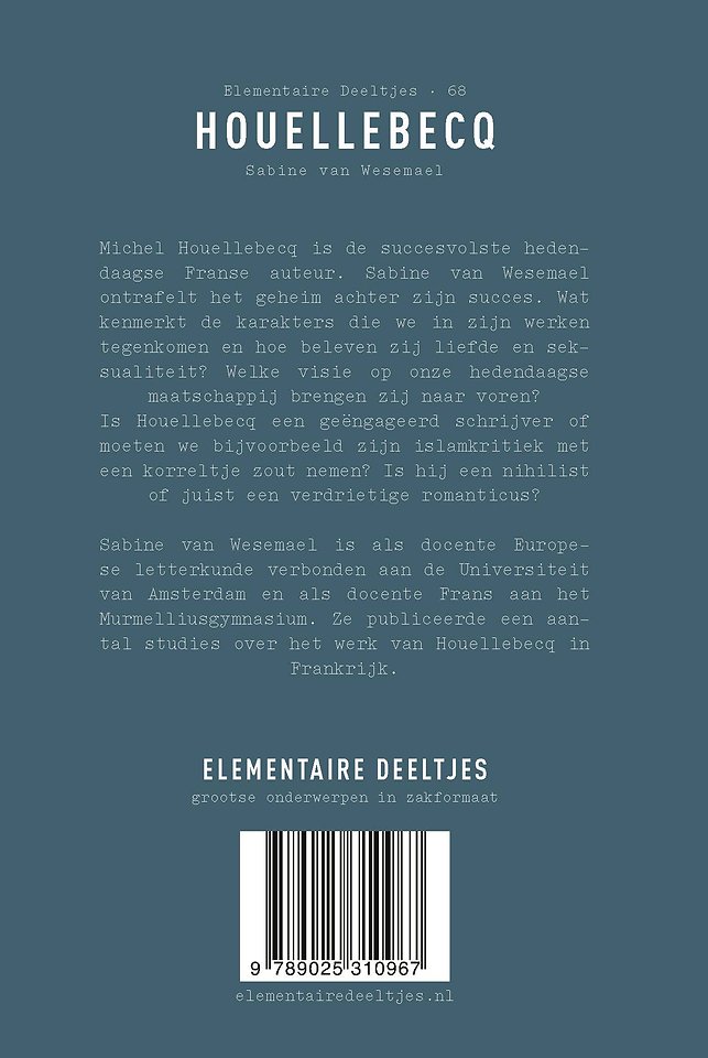 Michel Houellebecq is de succesvolste hedendaagse Franse auteur ter wereld. Sabine van Wesemael ontrafelt het geheim achter zijn succes. Wat kenmerkt de karakters die we in zijn werken tegenkomen en hoe beleven zij liefde en seksualiteit? Welke visie op onze hedendaagse maatschappij brengen zij naar voren? Is Houellebecq een geëngageerd schrijver of moeten we bijvoorbeeld zijn islamkritiek met een korreltje zout nemen? Is hij een nihilist of juist een verdrietige romanticus? En is zijn werk verwant met dat van Arnon Grunberg?