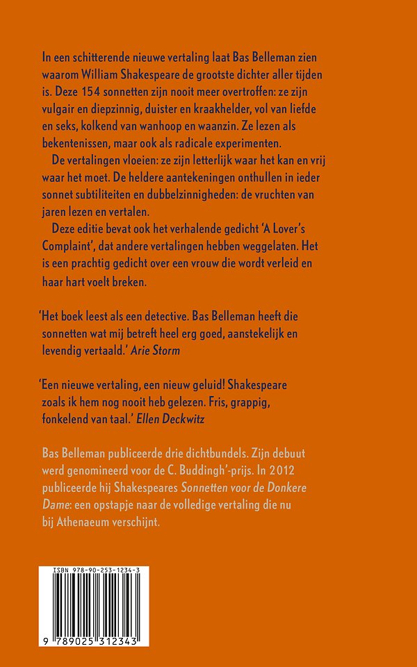 In een fonkelende nieuwe vertaling laat Bas Belleman zien waarom William Shakespeare de grootste dichter aller tijden is. Deze 154 sonnetten zijn nooit meer overtroffen: ze zijn vulgair en diepzinnig, duister en kraakhelder, vol van liefde en seks, kolkend van wanhoop en waanzin. Ze lezen als bekentenissen, maar ook als radicale experimenten.
