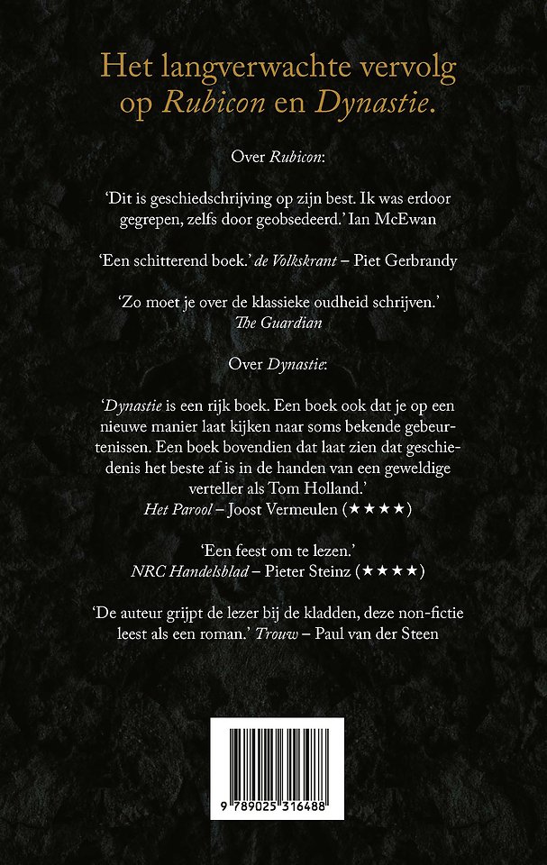 Alle grote gebeurtenissen komen voorbij: de val van Jeruzalem, de bouw van het Colosseum, de muur van Hadrianus, de veroveringen van Trajanus en de groei en verspreiding van het christendom. Pax biedt de veelomvattende geschiedenis van een uniek rijk in een unieke tijd, een spannend, intrigerend en onthutsend verhaal, verteld door de internationaal befaamde historicus Tom Holland.