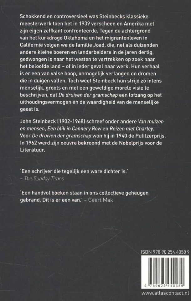 Hun verhaal is er een van valse hoop, onmogelijk verlangen en dromen die in duigen vallen. Toch weet Steinbeck hun strijd zó intens menselijk, groots en met een geweldige morele visie te beschrijven, dat 'De druiven der gramschap' een lofzang op het uithoudingsvermogen en de waardigheid van de menselijke geest is.
