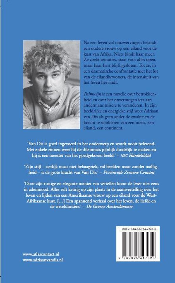 Na een leven vol omzwervingen belandt een oudere vrouw op een eiland voor de kust van Afrika. Niets bindt haar meer. Ze zoekt sensaties, staat voor alles open, maar haar hart blijft gesloten. Tot ze, in een dramatische confrontatie met het lot van de eilandbewoners, de intensiteit van het leven hervindt. Palmwijn is een novelle over betrokkenheid en over het onvermogen iets aan andermans misère te veranderen. In zijn beeldrijke en energieke stijl weet Adriaan van Dis als geen ander de zwakte en de kracht te schilderen van een mens, een eiland, een continent.