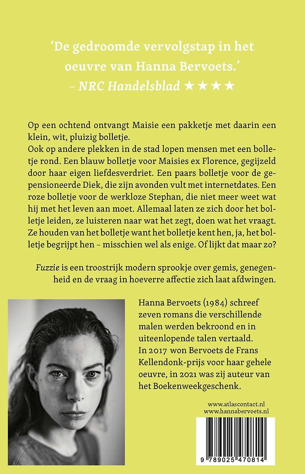 In ‘Fuzzie’ van Hanna Bervoets ontvangt Maisie op een ochtend een pakketje met daarin een klein, wit, pluizig bolletje. Ook op andere plekken in de stad lopen mensen met een bolletje rond. Een blauw bolletje voor Maisies ex Florence, gegijzeld door haar eigen liefdesverdriet. Een paars bolletje voor de gepensioneerde Diek, die zijn avonden vult met internetdates. Een roze bolletje voor de werkloze Stephan, die niet meer weet wat hij met het leven aan moet. Allemaal laten ze zich door het bolletje leiden, ze luisteren naar wat het zegt, doen wat het vraagt. Ze houden van het bolletje want het bolletje kent hen, ja, het bolletje begrijpt hen – misschien wel als enige. Of lijkt dat maar zo?