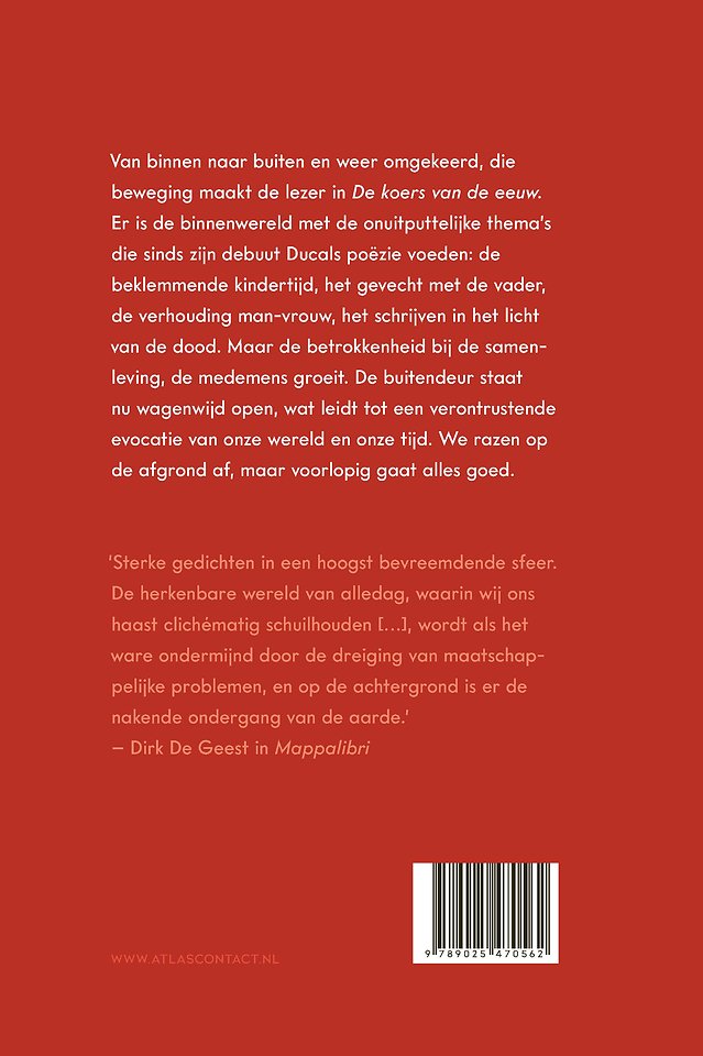 Van binnen naar buiten en weer omgekeerd, die beweging maakt de lezer in ‘De koers van de eeuw’ van Charles Ducal. Er is de binnenwereld met de onuitputtelijke thema’s die sinds zijn debuut Ducals poëzie voeden: de beklemmende kindertijd, het gevecht met de vader, de verhouding man-vrouw, het schrijven in het licht van de dood. Maar de betrokkenheid bij de samenleving, de medemens groeit. De buitendeur staat nu wagenwijd open, wat leidt tot een verontrustende evocatie van onze wereld en onze tijd. We razen op de afgrond af, maar voorlopig gaat alles goed.