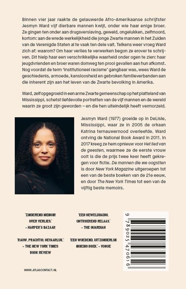 In ‘De mannen die we oogstten’ schetst de gelauwerde Afro-Amerikaanse schrijfster Jesmyn Ward vijf liefdevolle portretten van de dierbare mannen die zij binnen vier jaar kwijtraakte. Ze gingen ten onder aan drugsverslaving, geweld, ongelukken, zelfmoord, kortom: aan de wrede werkelijkheid die jonge Zwarte mannen in het Zuiden van de Verenigde Staten al te vaak ten dele valt. Telkens weer vroeg Ward zich af: waarom? Om haar verlies te verwerken begon ze erover te schrijven. Dit hielp haar een verschrikkelijke waarheid onder ogen te zien: haar jeugdvrienden en broer waren domweg ten prooi gevallen aan hun afkomst. Nog voordat de term ‘institutioneel racisme’ gangbaar was, wees Ward de geschiedenis, armoede, kansloosheid en gebroken familieverbanden aan die inherent zijn aan het leven van de Zwarte bevolking in Amerika.