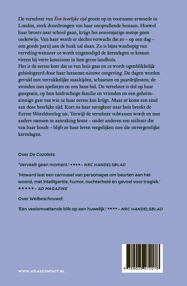 In ‘Een heerlijke tijd’ van Elizabeth Jane Howard groeit de vertelster op in voorname armoede in Londen, sterk doordrongen van haar onopvallende bestaan. Hoewel haar broers naar school gaan, krijgt het zestienjarige meisje geen onderwijs. Van haar wordt er slechts verwacht dat ze – op een dag – een goede partij aan de haak zal slaan. Ze is bijna wanhopig van verveling wanneer ze wordt uitgenodigd de kerstdagen te komen vieren bij verre kennissen in hun grote landhuis. Het is de eerste keer dat ze van huis gaat en ze wordt ogenblikkelijk gebiologeerd door haar luxueuze nieuwe omgeving. De dagen worden gevuld met verrukkelijke maaltijden, schaatsen en paardrijlessen; de avonden met spelletjes en een heus bal. De vertelster is dol op haar gastgezin, op hun luidruchtige familie en vrienden en een geheimzinnige gast van wie ze haar eerste kus krijgt. Maar er komt een eind aan deze heerlijke tijd. Kort na haar terugkeer naar huis breekt de Eerste Wereldoorlog uit. Terwijl de vertelster volwassen wordt en met andere mensen in aanraking komt – onder anderen een militair die van haar houdt – blijft ze haar leven vergelijken met die onvergetelijke kerstdagen.