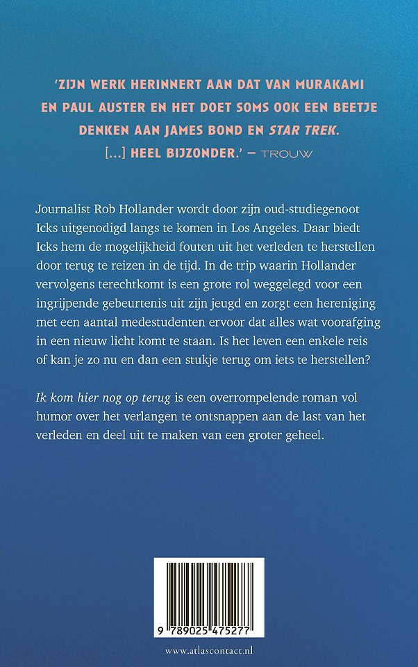 tijdreizen roman het verleden herstellen identiteit schuld spijt herinneringen jeugdtrauma tweede kans filosofie nostalgie literatuur realiteit versus fantasie studententijd ontmoeting uit het verleden keuzes en gevolgen journalistiek retrospectie reflectie confrontatie eenzaamheid metamorfose determinisme menselijke relaties los angeles levensverhaal vervreemding vriendschap metafysica werkelijkheidsperceptie