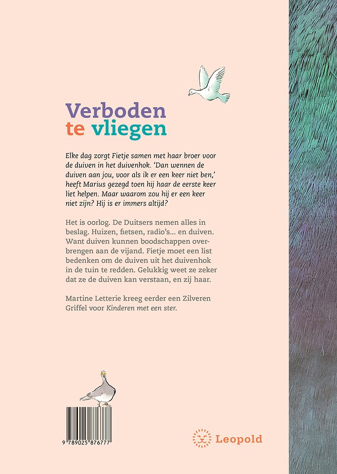 Het is oorlog. De Duitsers nemen alles in beslag. Huizen, fietsen, radio’s... en duiven. Want duiven kunnen boodschappen overbrengen aan de vijand. Fietje moet een list bedenken om de duiven te redden. Gelukkig weet Fietje zeker dat ze de duiven kan verstaan, en zij haar. Vanuit een verrassend perspectief brengt Martine Letterie de Tweede Wereldoorlog tot leven voor jonge kinderen, zoals ze dat eerder zo prachtig gedaan heeft in het met een Zilveren Griffel bekroonde Kinderen met een ster.