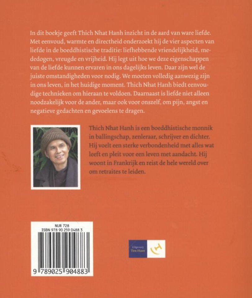 In dit boek geeft Thich Nhat Hanh inzicht in de aard van ware liefde. Met eenvoud, warmte en directheid onderzoekt hij de vier aspecten van liefde in de boeddhistische traditie: liefhebbende vriendelijkheid, mededogen, vreugde en vrijheid. Hij legt uit hoe we deze eigenschappen van de liefde kunnen ervaren in ons dagelijks leven. Daar zijn wel de juiste omstandigheden voor nodig. We moeten volledig aanwezig zijn in ons leven, in het huidige moment.