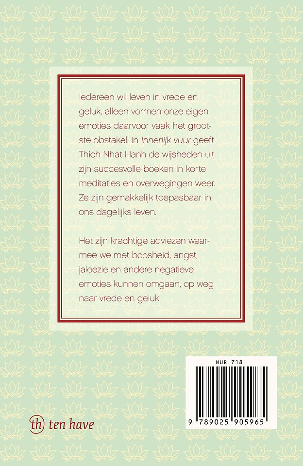 Thich Nhat Hanhs Innerlijk vuur staat vol met wijsheden, korte overdenkingen, meditaties en reflecties. Allemaal hebben ze betrekking op basis-emoties waarmee iedereen dagelijks te maken heeft. Iedereen is op zoek naar geluk, maar onze emoties vormen vaak een groot obstakel. Of het nu gaat om angst, boosheid of afgunst, Thich Nhat Hanh laat zien hoe je iedere stemming om kunt buigen naar innerlijke vrede en liefde.