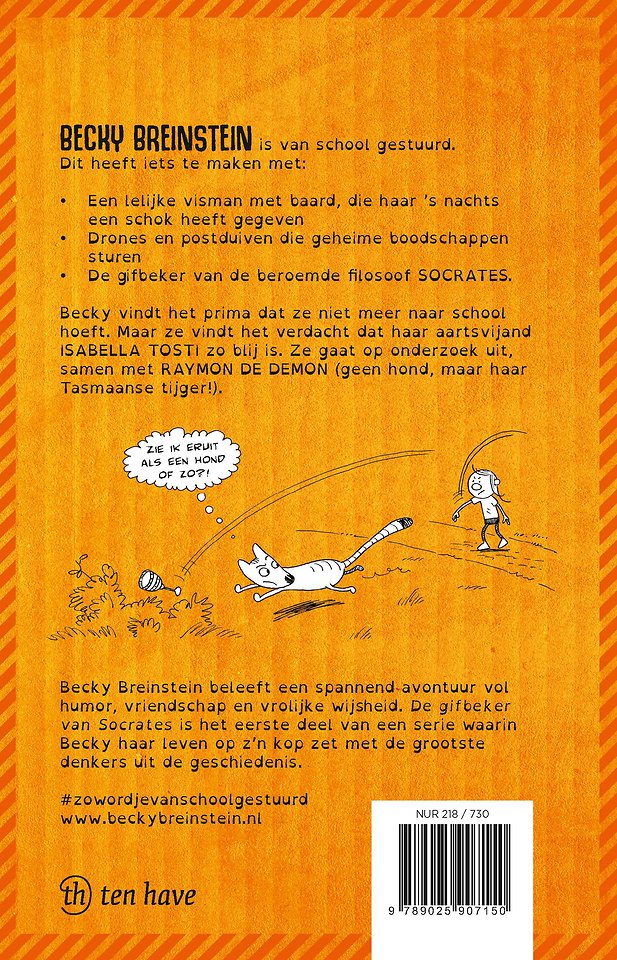 De nieuwe serie 'Becky Breinstein' laat jonge lezers kennismaken met de ontregelende kracht van filosofie. Het eerste deel, 'De gifbeker van Socrates', laat zien wat er gebeurt als je letterlijk de ideeën van de Griekse wijsgeer naleeft. Mensen worden woedend omdat je altijd de waarheid spreekt, boeken worden uit het raam gegooid: het wordt één grote puinhoop.