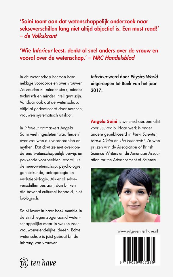 Er heersen hardnekkige vooroordelen over vrouwen. Zo zouden zij minder sterk, minder technisch en minder intelligent zijn dan mannen. In 'Inferieur' ontmaskert Angela Saini deze vooroordelen voorgoed. Dat doet ze met overdonderend wetenschappelijk bewijs en pakkende voorbeelden uit de neurowetenschap, psychologie, geneeskunde, antropologie en evolutiebiologie.