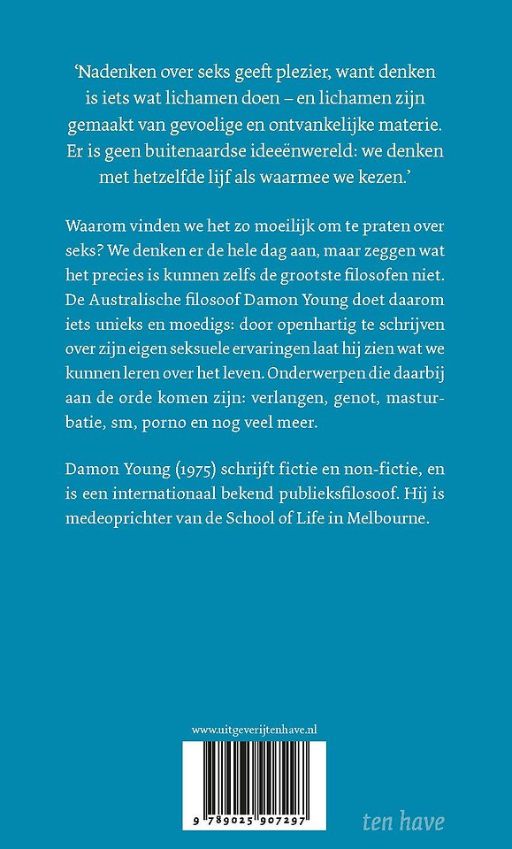 Waarom vinden we het zo moeilijk om te praten over seks? We denken er de hele dag aan, maar als we moeten zeggen wat het is, weten zelfs de grootste filosofen het niet precies. In dit nieuwe boek doet de Australische publieksfilosoof Damon Young iets unieks en moedigs: hij schrijft open over zijn eigen seksuele ervaringen en probeert te laten zien wat we daardoor kunnen leren over het leven. Onderwerpen die aan de orde komen zijn: verlangen, genot, masturbatie, sm, porno en nog veel meer.