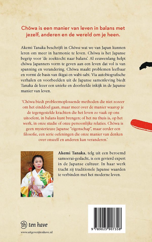 Akemi Tanaka beschrijft in 'Chowa' wat we van Japan kunnen leren om meer in harmonie te leven. Chowa is het Japanse begrip voor ‘de zoektocht naar balans’. Al eeuwenlang helpt chowa Japanners vorm te geven aan een leven dat vol is van spanning en verandering. Chowa maakt problemen leefbaar en vormt de basis van ikigai en wabi sabi. Via autobiografische verhalen en voorbeelden uit de Japanse samenleving biedt Tanaka de lezer een unieke en doorleefde inkijk in de Japanse manier van leven.
