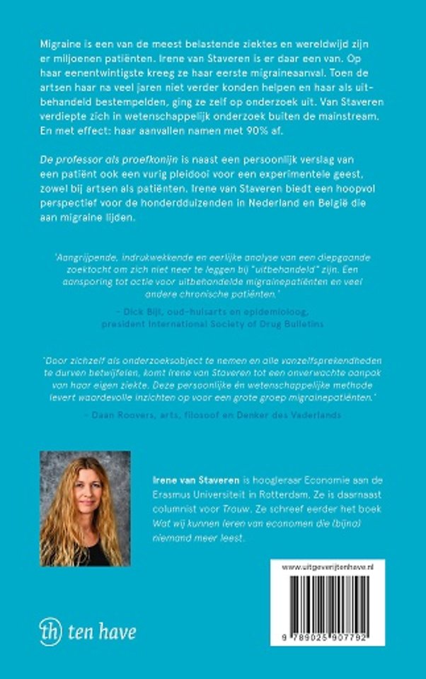 ‘De professor als proefkonijn’ is het persoonlijke verslag van een uitbehandelde migrainepatiënt. Toen de artsen Irene van Staveren niet verder konden helpen, ging ze zelf op onderzoek uit. Zij verdiepte zich in wetenschappelijk onderzoek buiten de mainstream. En met effect: de aanvallen namen met 90% af.