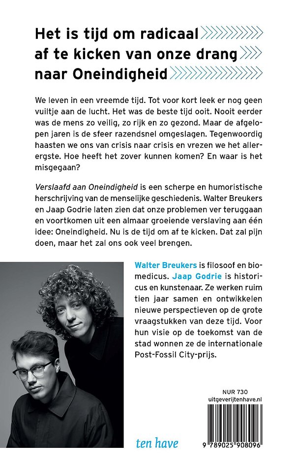We leven in een vreemde tijd. Tot voor kort leek er nog geen vuiltje aan de lucht. Het was de beste tijd ooit. Nooit eerder was de mens zo veilig, zo rijk en zo gezond. Maar de afgelopen jaren is de sfeer razendsnel omgeslagen. Tegenwoordig haasten we ons van crisis naar crisis en vrezen we het allerergste. Hoe heeft het zover kunnen komen? Waar is het misgegaan? Breukers en Godrie laten zien dat onze problemen ver teruggaan en voortkomen uit een almaar groeiende verslaving aan één idee: Oneindigheid. Nu is de tijd om af te kicken.