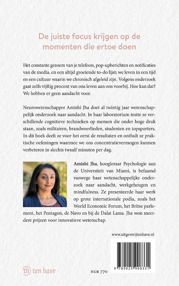 Neurowetenschapper Amishi Jha doet al twintig jaar wetenschappelijk onderzoek naar aandacht. In haar laboratorium testte ze verschillende cognitieve technieken op mensen die onder hoge druk staan, zoals militairen, brandweerlieden, studenten en topsporters. In dit boek deelt ze voor het eerst de resultaten en onthult ze praktische oefeningen waarmee we ons concentratievermogen kunnen verbeteren in slechts twaalf minuten per dag.