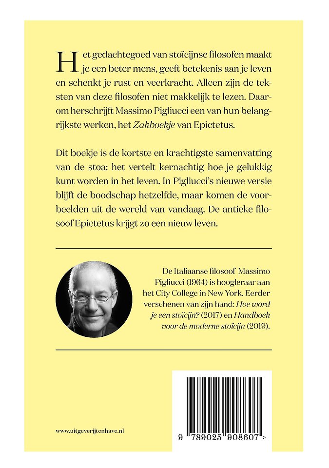 Het stoïcijns gedachtegoed maakt je een beter mens, geeft betekenis aan je leven en schenkt je rust en veerkracht. Jammer genoeg zijn de teksten van deze filosofen niet makkelijk te lezen. Massimo Pigliucci herschrijft een van de belangrijkste teksten van de stoïcijnen, het Zakboekje van Epictetus. Het zakboekje is te beschouwen als de kortste en meest krachtige samenvatting van de stoa: het is een kernachtige how to-gids voor hoe je gelukkig kunt worden in het leven. In deze nieuwe versie blijft de boodschap hetzelfde, maar komen de voorbeelden uit de wereld van vandaag. De antieke filosoof Epictetus krijgt zo een nieuw leven.